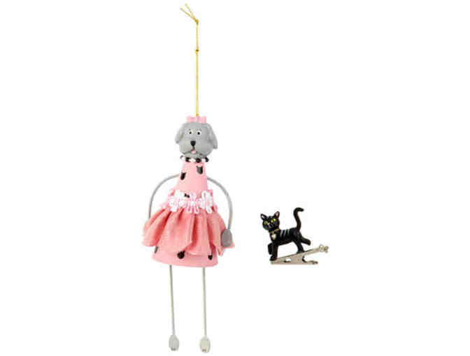 Trim the tree in distinctive style with this fun whimsical ornament and coordinating charm from Betsey Johnson. The ornament is a gray dog with pink dress with black cat faces and a black and white necklace. Charm is a black cat with glitter collar attached to a silver-tone clothes pin. Dog ornament measures 6.5” Long and cat measures It's a gift that will be remembered fondly every year when the decorations come out or used year round as decoration! Comes in gift box. Wonderful gift for your favorite girl!