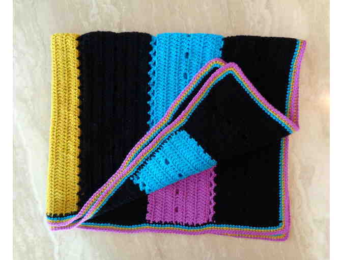 On those chilly winter nights, keep warm with this striking black, turquoise, magenta, & gold lap quilt. Crocheted using soft acrylic yarn in 5" stripes. Measures 28" x 37". Very pretty!