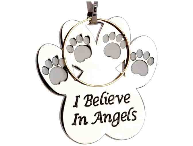 The words "I Believe in Angels" are a loving reminder of all of Earth's blessings with four paws. Silver-tone pawprint shape with 4 enamel pawprints and a gold-tone ring representing a halo. Measures 2.5" H x 2.5" W. This ornament is a beautiful and sentimental way of honoring the life of your beloved furry friend. Comes in gift box.
