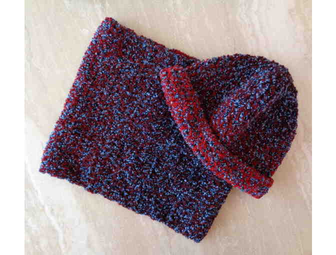Beat the cold this winter by wearing this thick, plush, & warm hat & cowl set. Hat brim can be worn up or down. Made of acrylic boucle tweed of variant reds & blues. Cowl measures 28" around.