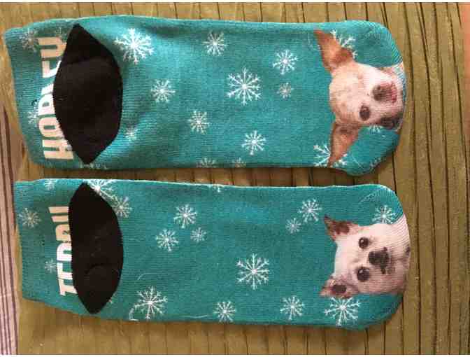 New, unique, custom designed socks. One sock features Harley and one sock features Teddy. Both are a knit, turquoise material with Harley and Teddy's names in silver as well as silver snowflakes scattered throughout. Perfect for keeping cozy on a winter night while thinking of our favorite heroes!
