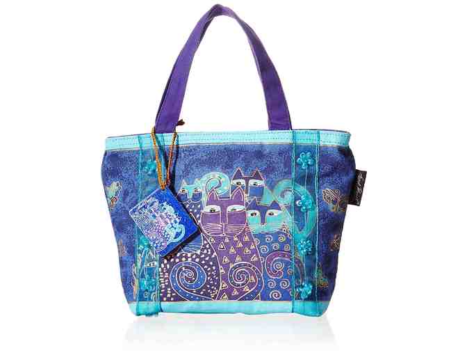 Laurel Burch small cotton canvas tote handbag. New with tags. Features 6 cats with butterfies in rich indigo, blue, purple, gold and turquoise colors. The front has a line of turquoise sequence and beads sewn in flower design on each end. The handbag measures 11 in. x 8 in. x 3 in. Handle drop of 6 in.