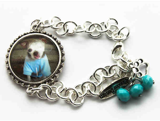 Beautiful, adjustable charm braclet which includes photo of Harley, plus 3 turquoise stone beads and a pawprint charm. By Plunder Designs.