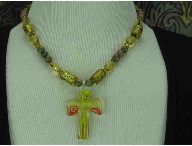 Art Glass Cross Pendant , Genuine CITRINE and Yellow Jade featured in 1/Kind Necklace!