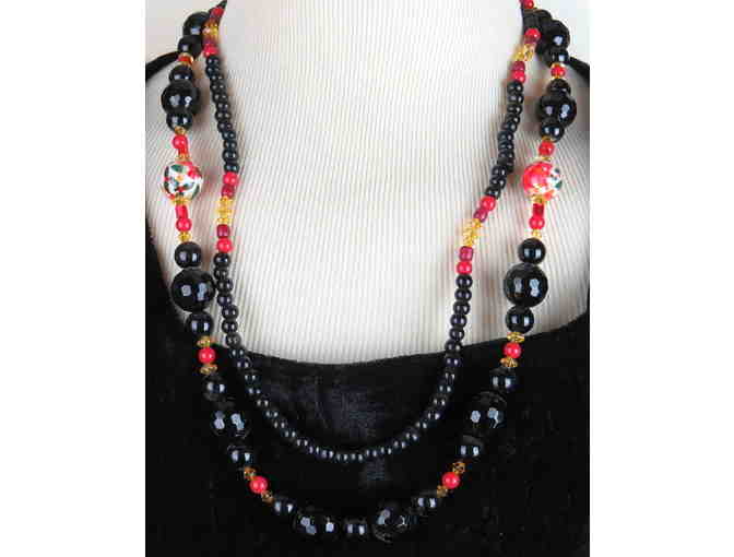 Coral, Obsidian and Onyx featured in this 1/KIND, Handcrafted GEMSTONE NECKLACE #342