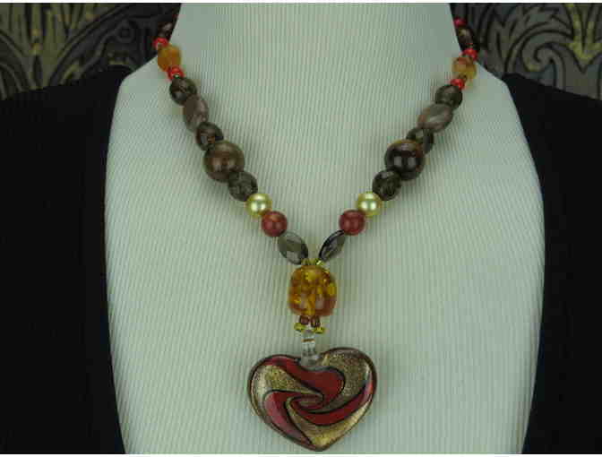Romantic Necklace w/Amber, Coral, Tigers Eye and Art Glass Heart Pendant! Handcrafted 63