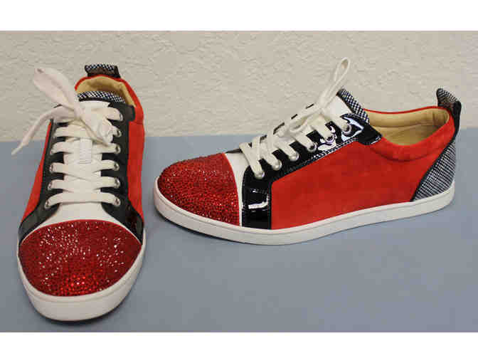 Signature Louboutin Swarovski crystal embellished toe box and an eclectic mix of red suede, black patent leather and navy blue plaid accents make for a stunning pair of sneakers. With signature red soles.