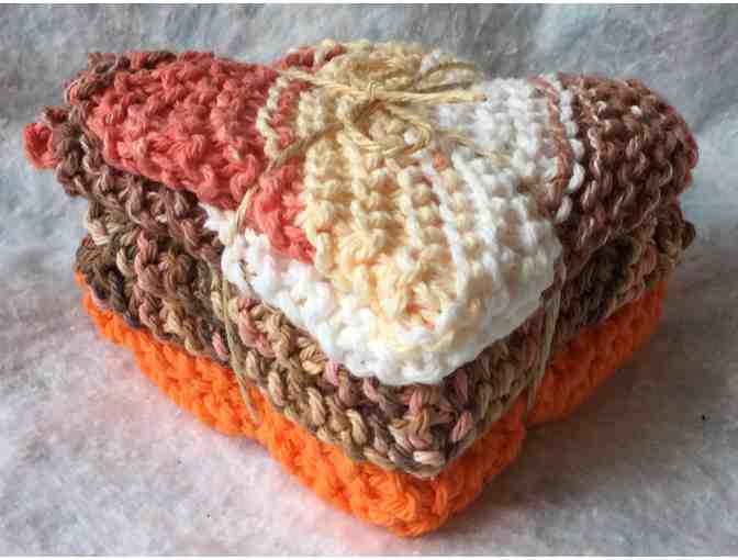 Set of 3 hand knitted dish cloths great for dishwashing. They measure about 8" square.