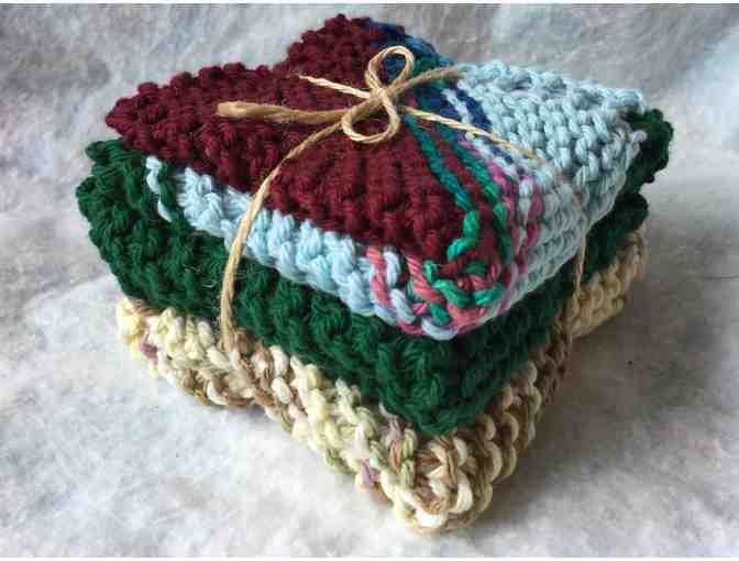 Set of 3 hand knitted dish cloths great for dishwashing. They measure about 8" square.