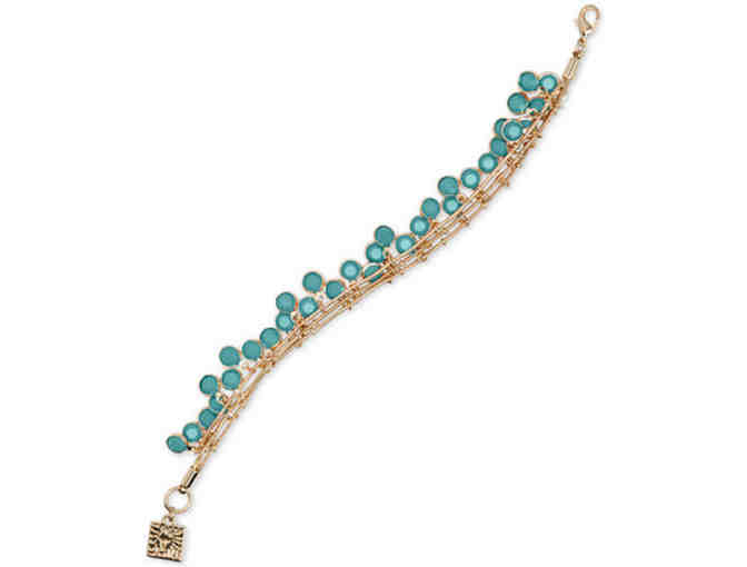 Shake up some fabulous color with the unique styling of this three-row dangling Turquoise color stone link bracelet created by Anne Klein in gold-tone. Approximate length: 7-1/4". Comes in gift box. See coordinating necklace listed on Auction as Item No. 411.