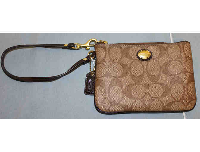 Coach Signature Logo PVC Wristlet with top zip and gold tone hardware.
