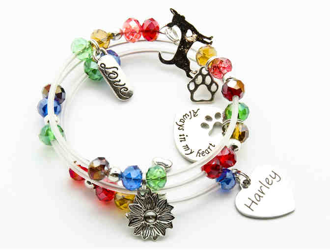According to the designer, Sue Adams: This is a memory wire bracelet with glass beads in rainbow colors. Included are 7 charms: a laser engraved heart charm which reads "Harley", a cut-out charm which reads "Always In My Heart", a paw print outline shaped charm, a charm that reads "love", a sunflower charm, a dog bone charm, and a Chihuahua silhouette. This bracelet will fit a 6.5 to 7.5 inch wrist. Please treat it gently and do not wear in water.