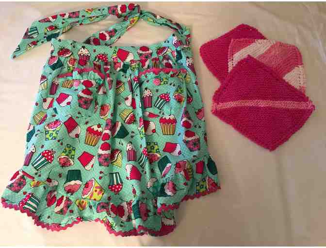 Apron with matching set of 3 hand knitted dish cloths great for dishwashing. Apron is half-length and has two pockets. Three dish cloths measure about 8" square.
