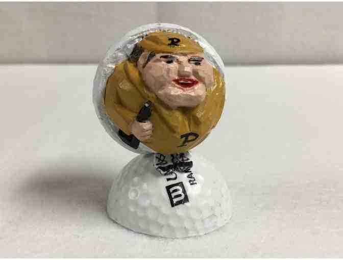 Wood-carving is a popular hobby, but Paul's choice of media on which to highlight his craft for this auction item is slightly unusual. Golf balls. He carves faces into the hard rubber center of a golf ball. 2 1/2" tall