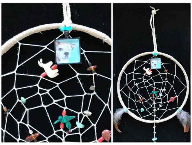 Handcrafted one-of-a-kind dreamcatcher. Measures 7" in diameter and is decorated with teal and red natural beads, two animal shaped beads and most importantly Sue Repash's Harley pendant! A dreamcatcher's purpose is to catch good dreams and send bad dreams away. What better way to promote Harley's Dream than with this custom Harley dreamcatcher!