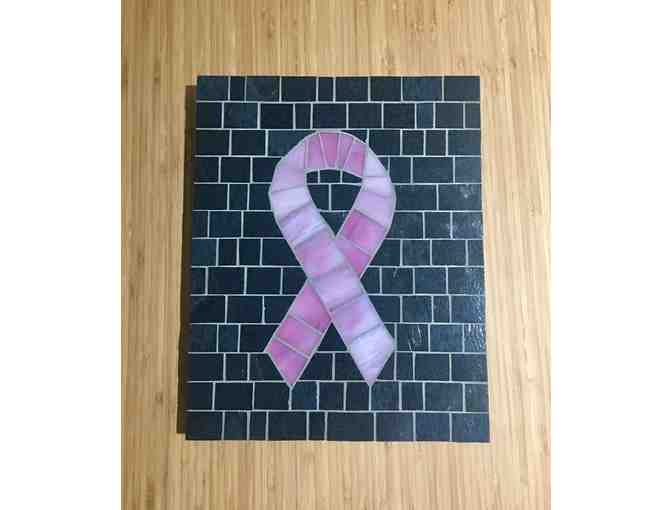 Tieton Mosaic - Combing age-old techniques with bold typographic designs. This custom glass tile mosaic features a pink ribbon to represent breast cancer awareness and support of survivors. A wall hanging – a table decoration – an artistic trivet – your choice. This beautiful piece of art was created by Tieton Mosaic are located in scenic Tieton, Washington.
