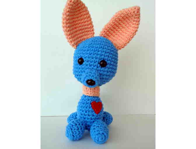 Meet adorable Pepper the Puppy; hand crocheted blue with peach accents. Has red heart on chest and black eyes and nose. 100% cotton. Measures 9". Perfect gift for nursery decoration or child over 3. Made especially for Pap 911 Auction by devoted supporter.