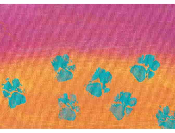 "Toes in the Desert Sky" is #3 in the Art by Teddy 'Where the Toes Can Go' collection. This is a unique, one-of-a-kind painting using non-toxic acrylic paints on a 5" x 7" canvas which includes Teddy's paw prints.