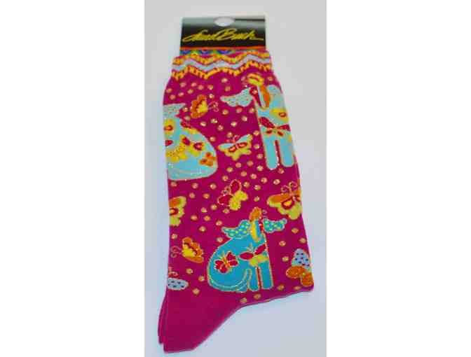 Step into a world of bold color and whimsical design with these vibrant colored cat and butterfly fuscia socks rendered by beloved artist Laurel Burch. Made of 70% cotton, 20% nylon, 10% spandex. Designed from original artwork by Laurel Burch. Machine wash warm, tumble dry low, only non-chlorine bleach when needed. Fits Women's sock size 9-11