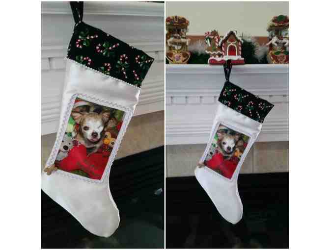 Handmade by Sharie Krebsbach. This white satin sock features an image of Harley between two plush toys and a plush bone in front of him that reads "Happy Howlidays". Accented with a bone shaped button on the bottom corner of the image and candy cane patterned material at the sock's top. Measures 16 1/2 inches long by 5 1/2 inches across. It has batting on the inside and is lined with white cotton material.