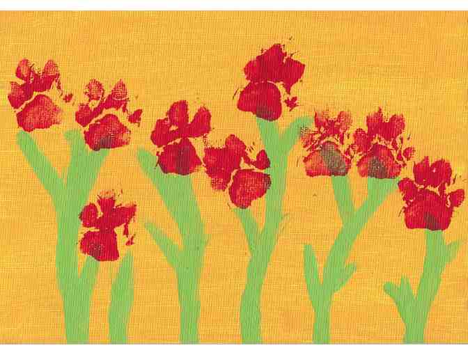 "Toes in the Flowers" is #12 in the Art by Teddy 'Where the Toes Can Go' collection. This is a unique, one-of-a-kind painting using non-toxic acrylic paints on a 5" x 7" canvas which includes Teddy's paw prints.