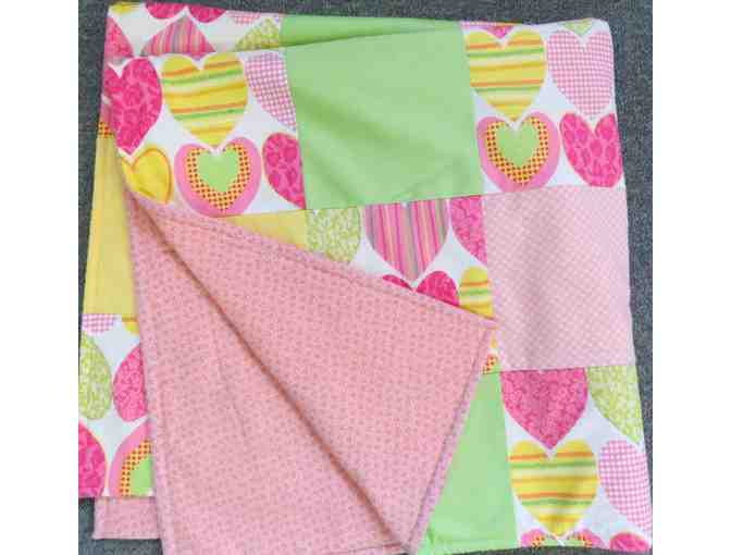 New, beautiful, handmade dog blanket/quilt. Measures approximately 34" x 34". Quilt design features solid light green squares, yellow dotted squares, pink background with white hearts squares, and coordinating colorful heart patterned squares. Reverse side is pink floral fabric. Wrap your dog in love and warmth with this "Happy Hearts" quilt. What every dog should have - a happy heart!