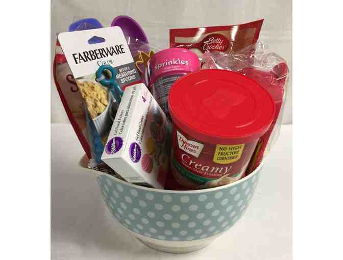 The mixing bowl is filled with: measuring cups, measuring spoons, a silicone spoon and spatula, four cookie cutters, two sugar cookie mixes, two tubs of vanilla frosting, set of four gel food colors, and also four colored sugar sprinkles to decorate your cookies. Dish towel also included.