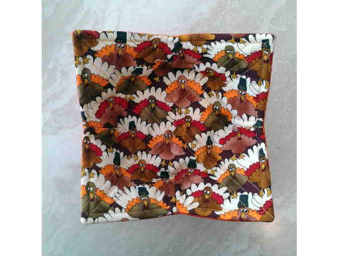We are lucky to be able to offer you this hand crafted microwave bowl once again. You don't have to burn your fingers any longer while taking a hot bowl out of the microwave. Has colorful turkey print on cream with red and gold sunburst design on reverse. 100% cotton & washable. Measures 7" square. BOWL NOT INCLUDED.