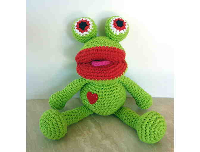 Meet Farley the Frog -- handsome in his hand crocheted lime green skiin. "A frog went a courtin' he did ride, uh -huh..." Measures 8" sitting. Wonderful gift. Made especially for the Auction by dedicated and talented Pap 911 supporter.