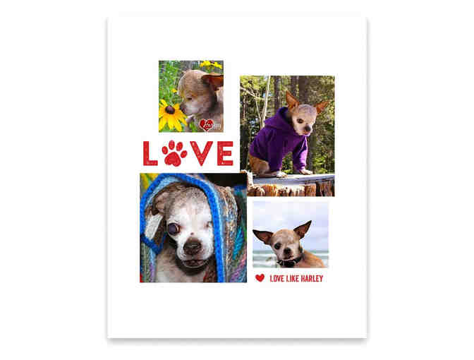 "Love Like Harley" 8"x10" Art Print on Signature Cardstock. This special collage of Harley images shows Harley in 4 of his best poses - including Harley sniffing yellow flowers, Harley wearing his famous purple hoodie sitting on his stump, Harley peeking out from one of his most recognizable knitted blankets, and last but not least, Harley looking straight into the camera with the ocean behind him! Text included in collage reads "LOVE" and "LOVE LIKE HARLEY". What better way to showcase our hero and share the love?