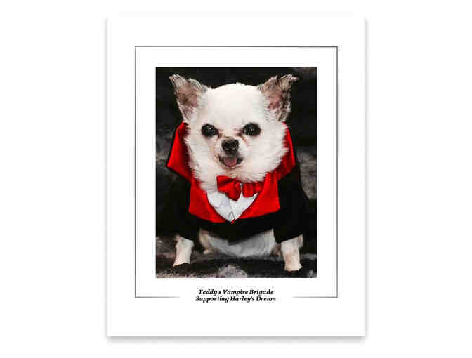 "Teddy's Vampire Brigade Supporting Harley's Dream" 8"x10" Art Print on Signature Cardstock. This frighteningly adorable image refers to Count Teddy leading his late-night voters known as the "Vampire Brigade" to vote for Harley's Dream in the "Life is Short, Make a Splash" contest. Happily, Harley's Dream won second place and was awarded $3,000 dollars to help pay for the children's coloring and activity books which will be distributed in schools nationwide. This print is a sure fire way to start a conversation and help Teddy take a bite out of puppy mills!