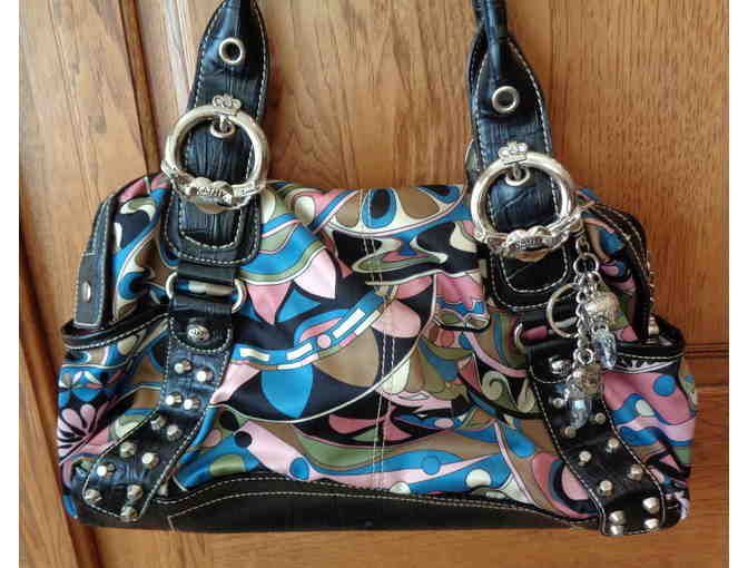 Modern geometric design in blue, pink, white, tan polyester fabric with heavy leather trimmings. Zippered closure with outer zippered pocket on one side and open side pockets on both sides. Inside has zippered pocket on one side and open pockets on the other side. Comfortable shoulder 10" shoulder drop. Has clear & silver-tone heart bag charms. Measures 14" W x 8" L x 4" D. Made by Kathy Van Zeeland. Very nice!