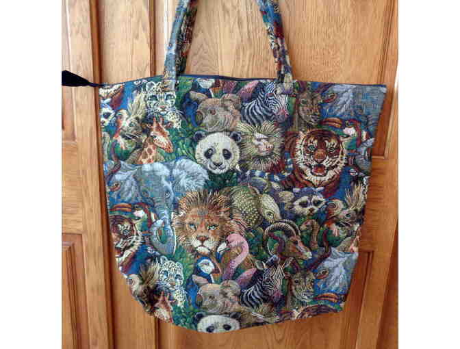 Colorful Jungle Animal Large Tapestry Tote. Zippered & unlined tote fits over your shoulder with an 11" drop. Measures 21" W x 18" L. Very nice!
