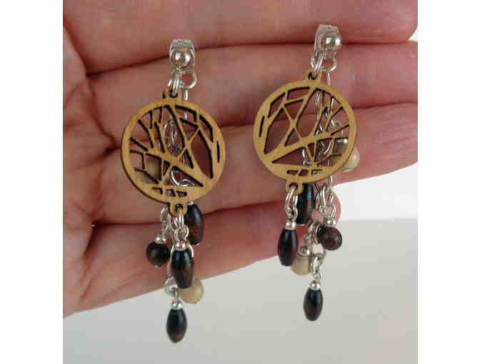 A chain of tan & brown wood beads with a 3/4" intricately detailed wood disk form this unique pair of earrings. Post backs. Measures 2.25".