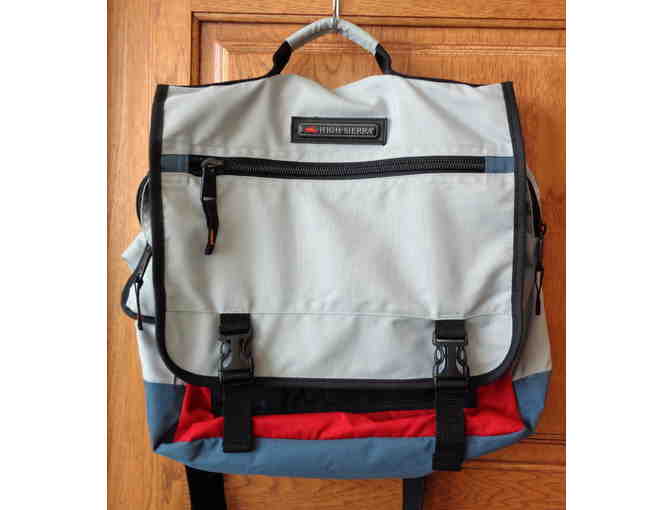 Light gray & black with red accent. Outer flap has a zippered slash pocket and closes with sturdy clips. Lift flap and see the variety of pocket sizes as shown in the picture. Adjustable cross-body shoulder strap with a handle as well. Measures 13" W x 14" L x 3.5" D. Made by High Sierra.