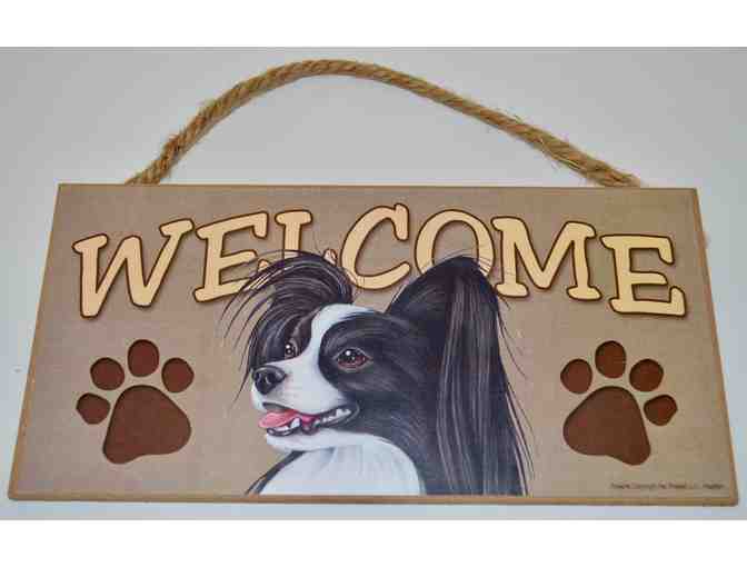 Really cute Papillon welcome sign that has HAPPY black & white Pap face with paw print on each side below the word WELCOME. Has rope hanger. Made by Love & Laughter Wooden Signs. Measures 10" x 5". Indoor use only.