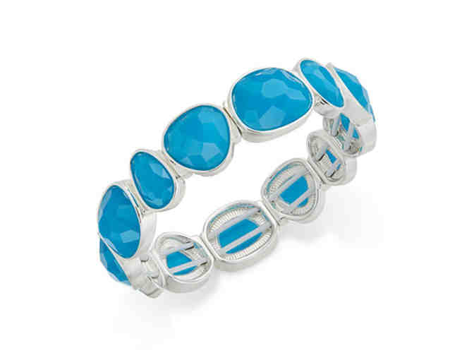 Colorful fashionistas will adore the vibrant hues of the turquoise-look blue stones in this Charter Club stretch bracelet set in silver-tone. Stones are faceted and in various shapes and sizes. Approximate diameter: 2-1/4”. Comes in gift box. Very pretty!