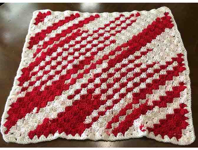 Inspired by the color of Harley's cape (red) this white and red, soft acrylic crocheted blanket features a beautiful diagonal striped and checkered pattern. Measures 25" x 25". The perfect size for a little one, be it furry or human.  Puppy NOT included. Keep your loved ones warm and cozy and be reminded of Harley's rescue work and the fight against puppy mills!
