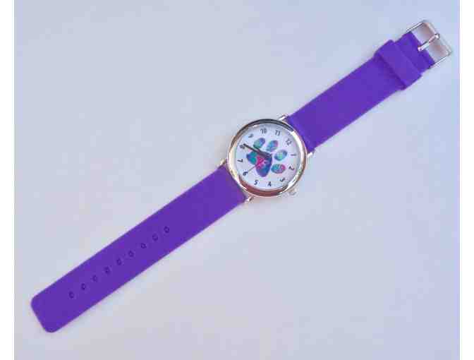 Any time's a good time to advocate for animal rescue. Watch has vibrant lavender band and dial has pawprints within a larger single colorful pawprint with crystal accents. This endlessly fun watch is set to spark conversation!