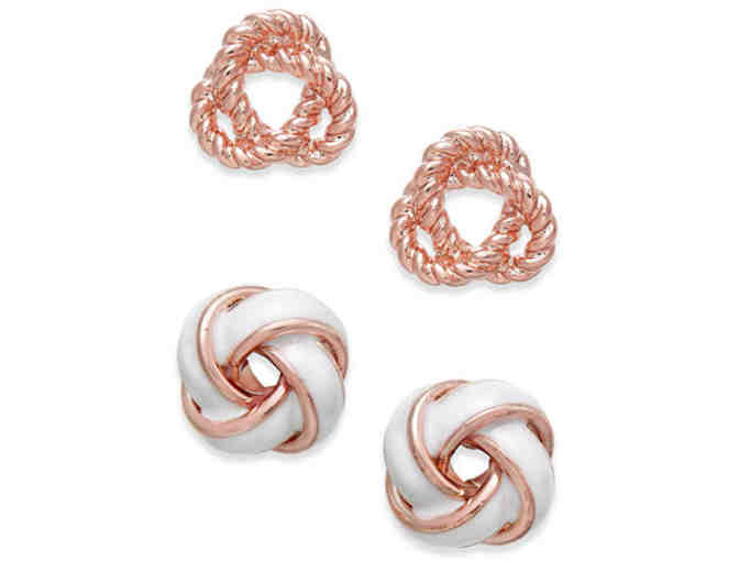 Charter Club puts a stylish spin on their classic knotted stud earrings. One pair is rope design in rose gold-tone and second pair is white enamel ribbon design edged in rose gold-tone. Approximate diameter of each design is 1/4”. Comes in gift box. Very pretty!