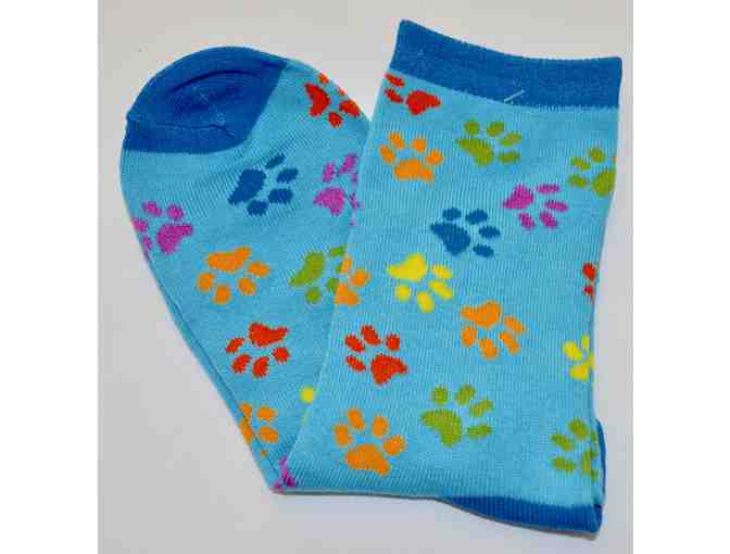 Cute pair of Two-toned blue socks covered with colorful pawprints. Size women's 9-11.
