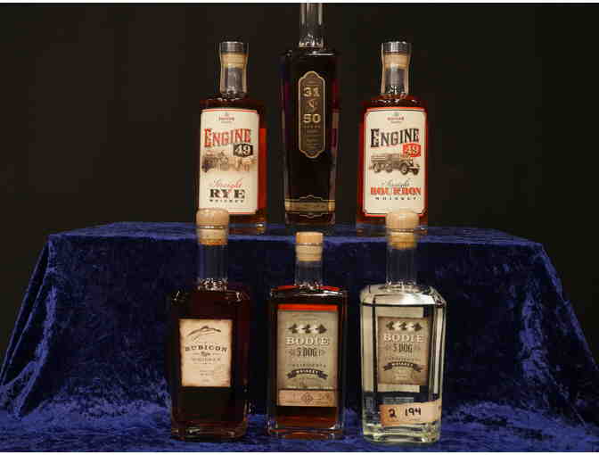 You’ll receive one bottle each of Bodie 5 Dog White California Whiskey, Amador Engine 49 Rye Whiskey, Bodie Aged Single Malt Whiskey, Amador Engine 49 Bourbon, 31 n 50 Bourbon Barrel #3 and Rubicon Whiskey Barrel #3.