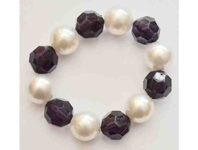 Hand crafted bracelet made with large white pearl smooth beads alternating with large faceted deep plum beads. Stretches to fit average wrist. Wear separately, or mix with your existing pieces! Comes in gift box.