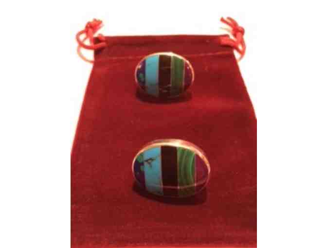These beautiful sterling silver earrings are stamped Mexico 925. The earrings include five different inlaid gemstones including onyx, apis, malachite, turquoise, and sugilite. A thin silver band is between each stone.