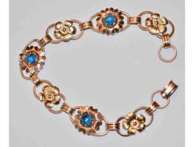 Pretty 12k gold bracelet that has 7 links with sculptured flower design. 4 are all gold and 3 are larger with azure blue bead at center. Measures 7" L. Has foldover clasp closure. Comes in gift box. In excellent condition.