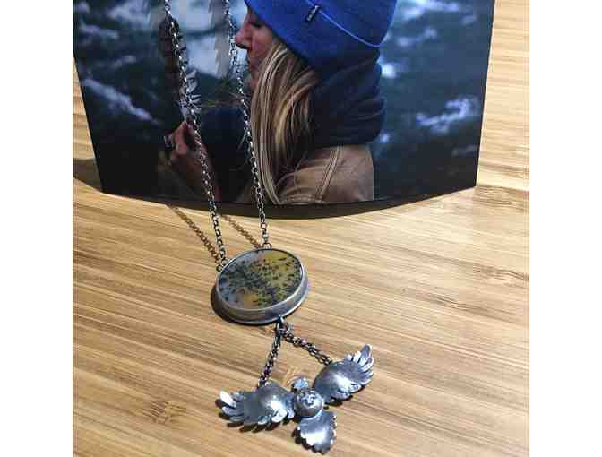 This Uplifted Necklace features a cut of Snake River dendritic agate in mustard hues and a bird that bears good medicine in its chest.