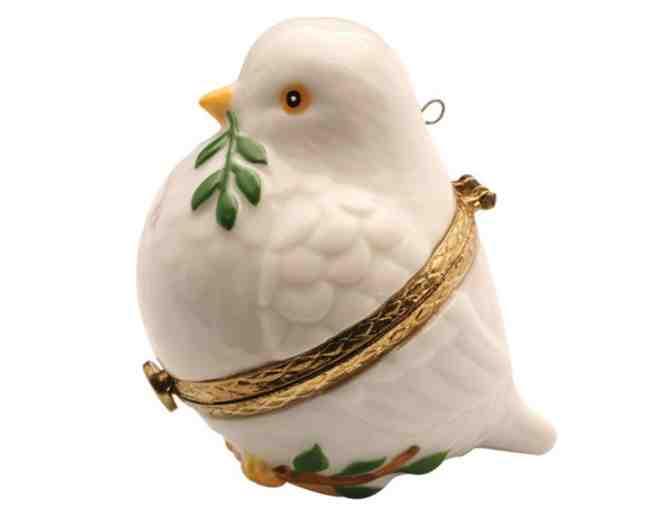 Precious little porcelain box, sized to hold small treats or tiny treasures. Tuck gifts, candy, or cash inside, then tie it to presents, hang it on the tree, hand it out as a party favor, drop it into a stocking, or add it to a place setting on your holiday table. Gold-tone metal trim and hinges (in Limoges style), with a gold thread hanging loop. 3-4" high, 2-3" wide.