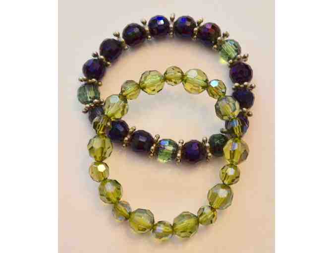 Set of 2 bracelets has one with pale iridescent green beads and one with iridescent deep purple, blue and pale green beads separated by flat silver-tone beads. Stretches to fit average wrist. Wear together, separately, or mix with your existing pieces! Comes in gift box. Very cute!