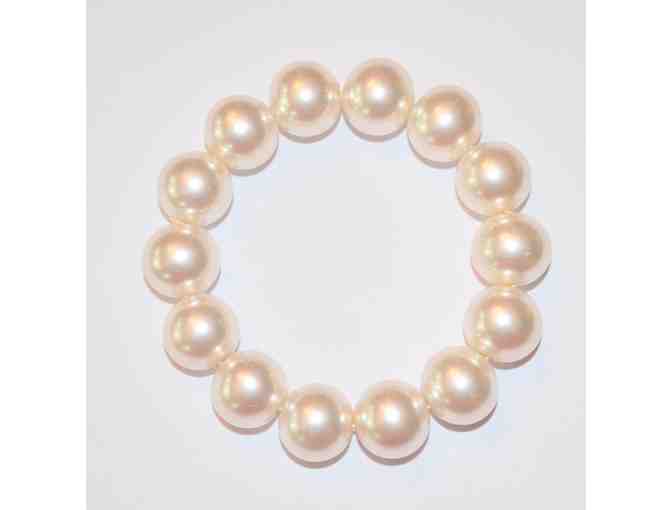 Hand-crafted bracelet made with large white pearl beads. Stretches to fit average wrist. Wear separately, or mix with your existing pieces! Comes in gift box.