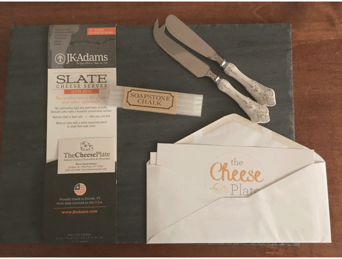 Bid on this beautiful JK Adams slate cheeseboard with soapstone chalk, a set of gorgeous cheese knives and a $15 gift certificate to the Cheese Plate in New Paltz, New York.